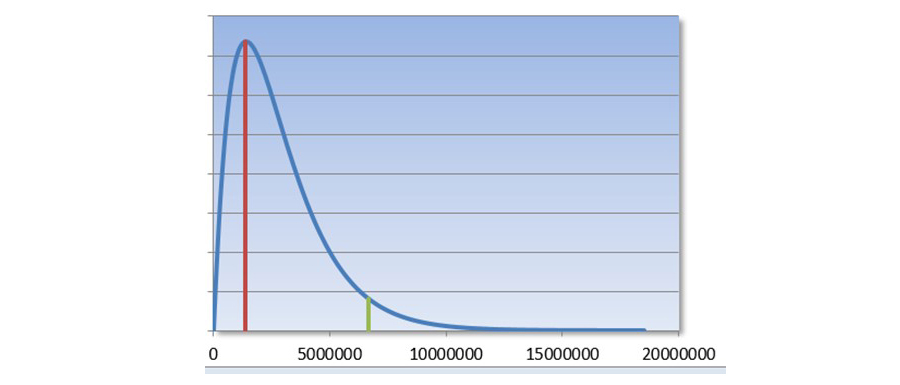 De rode lijn geeft de plek aan van de geprojecteerde afwijking en de groene lijn die van de maximale afwijking. De oppervlakte rechts van de groene lijn, onder de curve, is het steekproefrisico.
