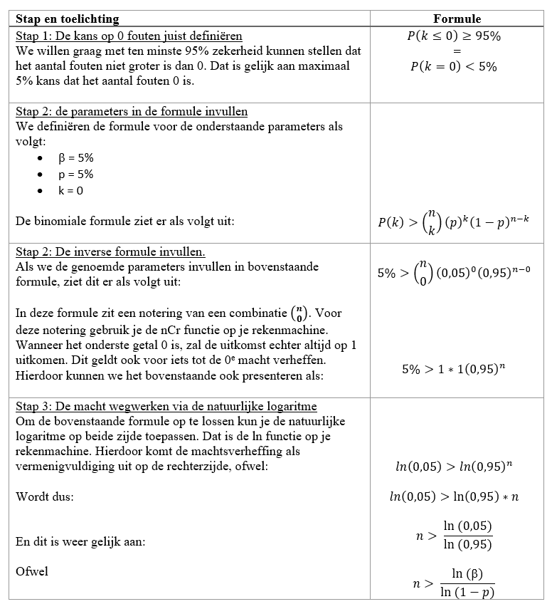 Laten we beginnen met het ophalen van de parameters uit de vorige columns. We werkten met een populatieomvang N = € 1mln. We hebben een materialiteit van p = 5 procent wat neer komt op € 50.000. We willen 95 procent betrouwbaarheid behalen, dus 1 - β = 95 procent. Omdat er alleen een gesloten formule bestaat voor nul fouten, houden we het verwachte foutpercentage op 0 procent, dat betekent dat het aantal verwachte fouten in de steekproef gelijk is aan k = 0. Dit kunnen we samenvatten in de volgende parameters: