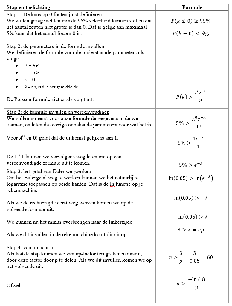 In deze column wordt duidelijk gemaakt waarom het terecht is dat je deze formule kunt gebruiken. De inverse Poisson-verdeling komt namelijk tot stand door de Poisson-formule zo in te richten dat de uitkomst van de formule de np-waarde is, in plaats van de betrouwbaarheid. Dit herinrichten gebeurd op vergelijkbare wijze als bij 12 = 3 x 4, wat gelijk is aan 3 = 12 / 4. Als we in de bestaande Poisson-formule alle parameters invullen behalve de np-waarde, dan kunnen we deze gesloten formule oplossen. Net zoals wanneer we de waarde van x kunnen vinden in de formule 3 = 12 / x. Dit kan handmatig wanneer het verwachte aantal fouten 0 is. Dit kan ook met de binomiale formule.