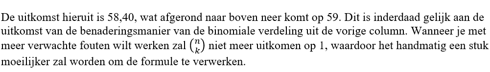 Voor de binomiale verdeling hebben we gezien dat de handmatige berekening aansluit met de benaderingsmethode uit de vorige column. Je weet nu dan ook waarom het terecht is dat je de inverse gamma verdeling kunt gebruiken. Hierdoor kun je goed onderbouwd gebruik maken van deze functie in Excel. In de volgende column zullen we kijken hoe een algoritme de benaderingsmanier automatiseert. In de opvolgende column gaan we kijken hoe je gebruik kunt maken van de gratis en open-source software JASP om de steekproefomvang te berekenen voor elk aantal verwachte fouten.