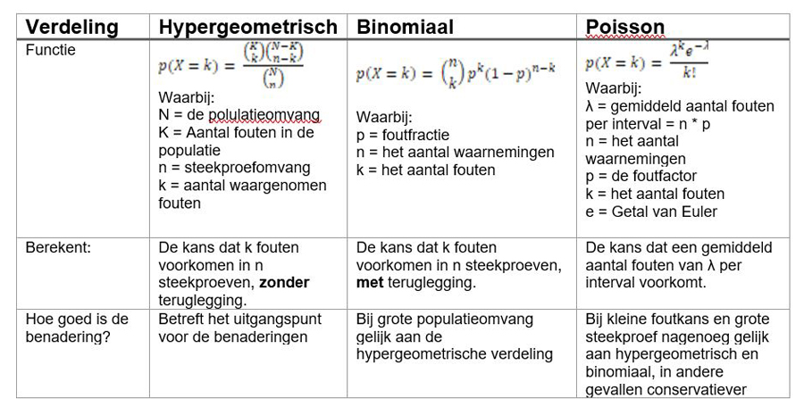 Er zijn tal van discrete verdelingen, maar drie zijn goed toepasbaar voor de audit. Dit zijn de hypergeometrische verdeling, de binomiale verdeling en de Poisson-verdeling. De reden dat specifiek deze drie verdelingen goed passen, is omdat al deze drie verdelingen kijken naar meerdere waarnemingen die te classificeren zijn in twee groepen. Er zijn namelijk ook verdelingen die kijken naar meer dan twee mogelijkheden, wat voor ons vraagstuk niet relevant is.