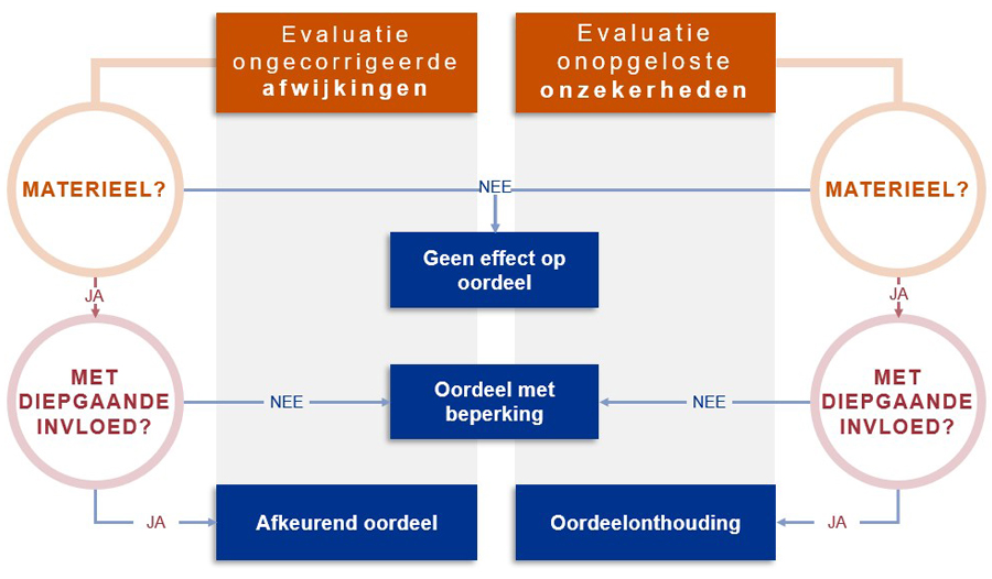 Een (mogelijk) gevolg van ongecorrigeerde afwijkingen en/of onzekerheden voor de jaarrekening dat alleen materieel is voor de jaarrekening, resulteert in een oordeel met beperking. (Mogelijke) gevolgen met een diepgaande invloed op de jaarrekening leiden, afhankelijk van de aard van het issue (afwijking of onzekerheid), tot een afkeurend oordeel of een oordeelonthouding.