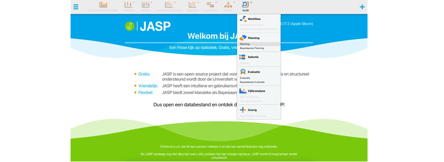 JASP (JASP Team, 2023) is een open source-softwarepakket voor statistische analyses dat gratis te downloaden is via www.jasp-stats.org. Het programma wordt veel gebruikt in wetenschappelijke kringen om statistiek te bedrijven. Zo wordt JASP in 2023 rond de vijftigduizend keer per maand gedownload en is het opgenomen in het curriculum van 264 universiteiten in 63 verschillende landen, waaronder Nyenrode Business Universiteit, de Universiteit Utrecht en de Universiteit van Amsterdam. Interessant voor accountants is dat JASP ook functionaliteit voor auditsteekproeven biedt via een Audit module (JASP for Audit; Derks et al., 2021a).