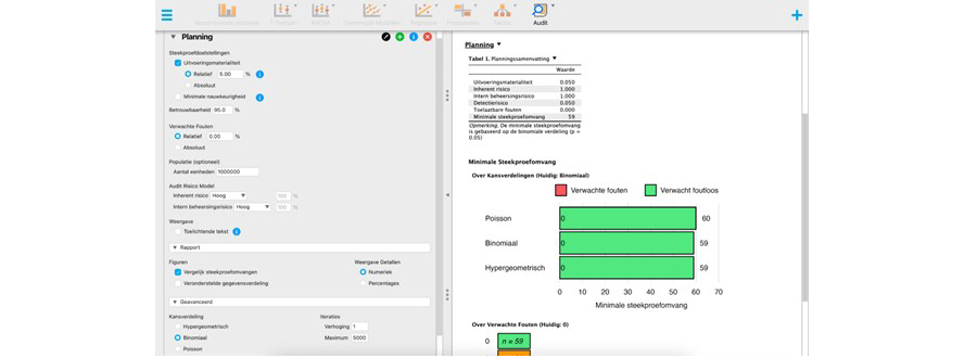 Door op 'Planning' te klikken kom je vervolgens in een interface waar je de steekproef kunt gaan plannen (zie de afbeelding hierboven). Dat wil zeggen, in de linkerkant van het scherm kun je de parameters voor de steekproef invullen om vervolgens automatisch een bijbehorende minimale steekproefgrootte te berekenen. De uitkomst van deze berekeningen is direct zichtbaar aan de rechterkant van het scherm. Zoals beschreven in de vorige columns kun je kiezen om op drie manieren de steekproefomvang te berekenen: hypergeometrisch, binomiaal of Poisson (Stewart, 2012).