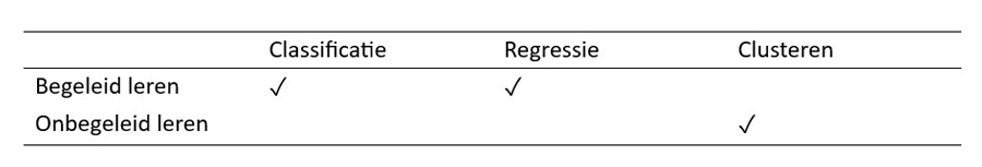 De drie hoofdtoepassingen van machine learning kunnen worden opgedeeld in twee categorieën: begeleid leren (supervised learning) en onbegeleid leren (unsupervised learning). Welke hoofdtoepassing bij welke categorie hoort, is in onderstaande tabel aangegeven met een vinkje.