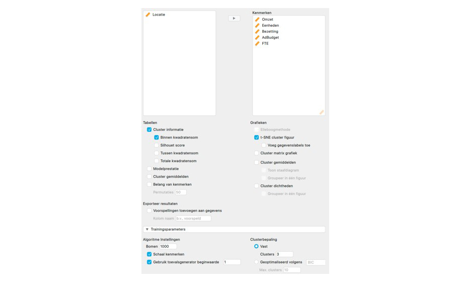 In de hieronder weergegeven interface vink je allereerst de optie 't-SNE cluster figuur' aan onder het kopje 'Grafieken'. Hiermee geef je aan dat je de verschillende clusters grafisch wilt laten weergeven. Daarna vouw je de sectie 'Trainingsparameters' open en selecteer je de optie 'Vast' onder het kopje 'Clusterbepaling', zodat het algoritme het standaard ingevulde aantal van drie clusters gaat bepalen. Je kunt hier ook zelf het aantal clusters instellen of het optimale aantal clusters door het algoritme laten bepalen. Vink in deze sectie ook meteen de optie 'Gebruik toevalsgenerator beginwaarde' aan. Daarmee stel je de willekeurige getallengenerator voor het clusteralgoritme in op de waarde 1, zodat de resultaten reproduceerbaar zijn op je eigen computer. Vervolgens sleep je alle kenmerken, behalve Locatie, naar het vak voor 'Kenmerken'.