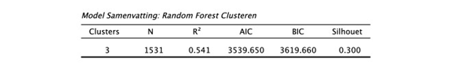 Zodra alle data zijn ingevoerd, start JASP met het toepassen van het clusteralgoritme. De resultaten worden hieronder getoond. De bovenste tabel biedt inzicht in de input voor het algoritme, zoals het aantal clusters dat we het algoritme hebben laten bepalen (3) en het totale aantal datapunten (1.531). Daarnaast laat het statistieken zien die iets zeggen over de kwaliteit van de output van het algoritme, zoals bijvoorbeeld de determinatiecoëfficiënt R2. In de vorige column over regressie is uitgelegd dat deze waarde een maatstaaf is voor de verklaarde variantie van een statistisch model. In een clusteringcontext betekent een R2-waarde van 0,541 dat het clusteringmodel 54,1 procent van de totale variantie in de gegevens kan verklaren. Met andere woorden: de door het model gevormde clusters verklaren ongeveer 54,1 procent van de spreiding in de datapunten rond de clustergemiddelden. De overige statistieken (AIC, BIC en silhouet score) kun je gebruiken om modellen met een verschillend aantal clusters te vergelijken. Voor het gemak gaan we daar in deze column niet op in, maar werken we met een vast aantal clusters.