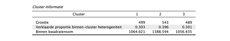 De tweede tabel in de output toont informatie over de clusters. Deze clusterinformatietabel laat zien dat 499 van de 1.531 locaties in de dataset zijn toegewezen aan de eerste cluster, terwijl 543 en 489 locaties respectievelijk zijn toegewezen aan de tweede en derde cluster. In de tweede en derde regel van de tabel kun je de binnen-cluster kwadratensom zowel in percentages als in absolute getallen aflezen. De binnen-cluster kwadratensom is een maatstaf die de spreiding van de gegevens binnen elke cluster aangeeft. Als je deze waarde uitdrukt als een percentage van de totale variantie in de gegevens, krijg je de verklaarde proportie binnen-cluster heterogeniteit. Deze maatstaf ligt tussen 0 en 1 en kan nuttig zijn om het relatieve belang of ‘gewicht’ van elk cluster te begrijpen. Een hoge waarde van de verklaarde proportie binnen-cluster heterogeniteit duidt op een cluster met veel variantie, mogelijk door een groot aantal datapunten of een grote spreiding van datapunten, terwijl een lage waarde duidt op een meer compacte cluster. In dit geval verklaart de tweede cluster ongeveer veertig procent van de totale verklaarde variantie, terwijl de eerste en de derde cluster elk ongeveer dertig procent van de totale variantie verklaren.