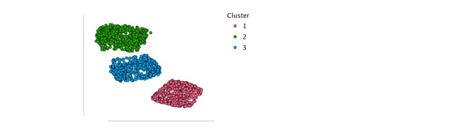 Het laatste element in de output is een tweedimensionale weergave van de kenmerken van de bedrijfslocaties, bekend als de t-SNE clustergrafiek. Het t-SNE algoritme is ontworpen om bedrijfslocaties, die vergelijkbaar zijn op basis van hun kenmerken, te projecteren naar punten die dicht bij elkaar liggen in de tweedimensionale ruimte. Tegelijkertijd worden bedrijfslocaties, die sterk verschillen in hun kenmerken, geprojecteerd naar punten die verder uit elkaar liggen in deze tweedimensionale ruimte. Deze visualisatie kan nuttig zijn om te bepalen hoeveel clusters je zou kunnen maken bij het opdelen van de gegevens. De t-SNE grafiek hieronder laat bijvoorbeeld drie te onderscheiden groepen van bedrijfslocaties zien die sterk op elkaar lijken. Dit geeft aan dat de drie clusters die we het algoritme hebben laten bepalen een goede representatie zijn van de groepsstructuur in de gegevens.