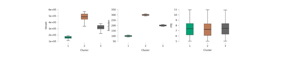 In de eerste twee figuren kun je zien dat de bedrijfslocaties in de eerste cluster zich onderscheiden door een relatief lage omzet en een laag aantal opslageenheden, terwijl de bedrijfslocaties in de tweede cluster een relatief hoge omzet en veel opslageenheden hebben. De derde cluster bevindt zich ergens tussen deze twee in. Dit suggereert dat de groepering van bedrijfslocaties wordt verklaard door de omvang van de locaties***. Het is interessant om op te merken dat, hoewel de bedrijfslocaties in drie clusters verschillen in omvang, deze gemiddeld evenveel fte’s aan de administratie hebben werken.