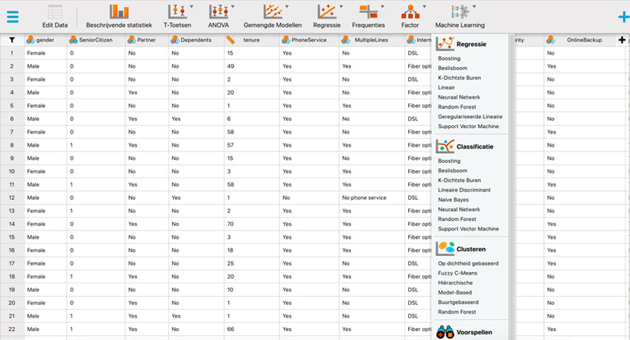 In dit voorbeeld gebruik ik een voor deze column licht bewerkte versie van de algemeen toegankelijke Telco Customer Churn-dataset*. Belangrijk om op te merken is dat het hier om voorbeeldgegevens gaat. In de praktijk kun je beter historische gegevens uit de database van de telecomprovider gebruiken.