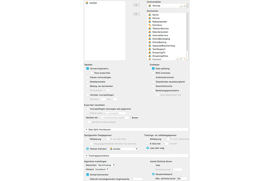 Zoals te zien is in de bovenstaande screenshot zijn er voor het leren van de relatie tussen de klantkenmerken en het klantverloop verschillende classificatiealgoritmes beschikbaar. In deze column kies ik voor een K-dichtste buren algoritme (James et al., 2023, pp. 183–188). Om dit algoritme in JASP te gebruiken, selecteer je in het Machine Learning menu de optie 'K-Dichtste Buren' onder 'Classificatie'. Vervolgens open je in de hieronder weergegeven interface de sectie 'Data Split Voorkeuren', selecteer je de optie 'Testset indicator' en wijs je deze de variabele testSet toe met behulp van het keuzemenu. Dit zorgt ervoor dat het algoritme de vooraf gespecificeerde 3.238 klanten gebruikt om het K-dichtste buren algoritme te trainen en de overige vijfhonderd klanten gebruikt om het algoritme te evalueren.