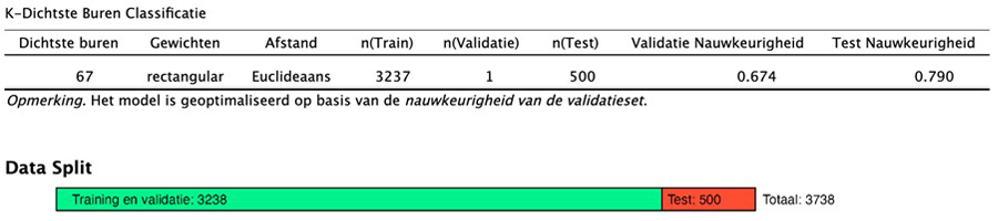 **** In dit voorbeeld wordt de trainingsfase gebruikt om de beste waarde voor 'K' te bepalen. Echter, in JASP heb je de mogelijkheid om zelf een waarde van 'K' in te voeren door onder 'Aantal Dichtste Buren' de optie 'Vast' te selecteren en de gewenste waarde van 'K' in te voeren in het bijbehorende veld. In dat geval is er geen sprake van een trainingsfase.