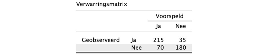 De onderstaande verwarringmatrix biedt meer inzicht in de prestaties van het algoritme door te tonen hoe de voorspellingen voor de klanten in de testset overeenkomen met de werkelijkheid. Uit de verwarringsmatrix blijkt dat het algoritme correct voorspelt dat 215 klanten het contract zouden opzeggen, en dat het ook correct voorspelt dat 180 klanten het contract niet zouden opzeggen. Dit leidt tot een nauwkeurigheid van het algoritme op de testset van (215 + 180) / 500 = 0,79, wat overeenkomt met 79 procent.