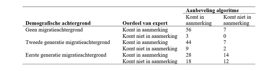 Aanvragers die zowel door het algoritme als door de expert als in aanmerking komend worden beoordeeld, worden echt-positieven (true positives, TP) genoemd. Daarentegen worden aanvragers die door het algoritme worden afgewezen, maar volgens de expert wél in aanmerking komen, fout-negatieven (false negatives, FN) genoemd2.