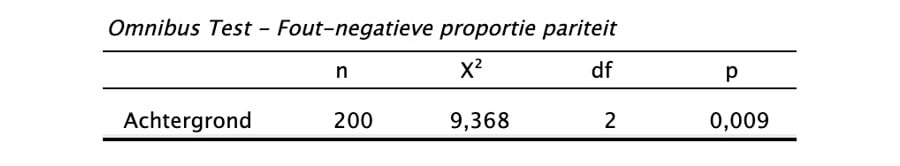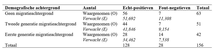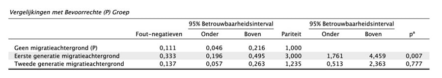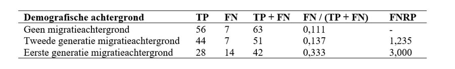 De proportie foutnegatieven bedraagt 0,111 voor aanvragers zonder migratieachtergrond, 0,137 voor aanvragers met een tweede generatie migratieachtergrond en 0,333 voor aanvragers met een eerste generatie migratieachtergrond. Vergeleken met de groep zonder migratieachtergrond is de proportie fout-negatieven dus 1,235 keer zo hoog voor aanvragers met een tweede generatie migratieachtergrond en zelfs drie keer zo hoog voor aanvragers met een eerste generatie migratieachtergrond.