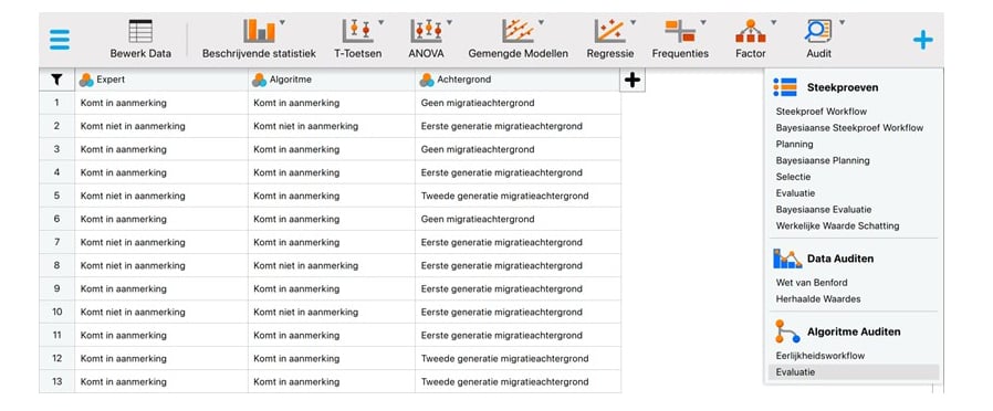 Het opstellen van de bovenstaande tabel en het uitvoeren van de bijbehorende berekeningen kan tijdrovend en complex zijn, vooral wanneer er meer dan drie groepen zijn of wanneer je met grote datasets werkt. JASP neemt je dit werk uit handen: het voert de analyse automatisch uit, identificeert welke groep mogelijk oneerlijk wordt behandeld en genereert een auditrapport met de resultaten en een duidelijke toelichting.