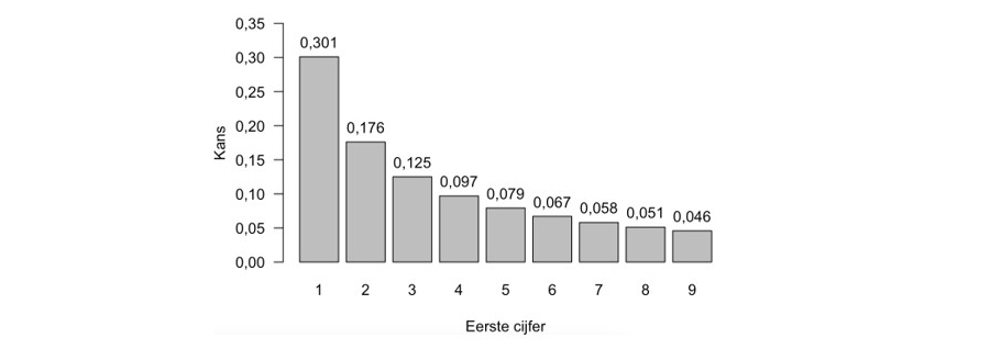 In 1938 toonde Frank Benford aan dat in veel natuurlijk voorkomende gegevens het cijfer 1 vaker als eerste cijfer voorkomt dan een 2, een 2 vaker dan een 3, enzovoort1. Dit komt doordat tellingen vaak beginnen bij lage getallen en niet altijd doorlopen tot hoge getallen. Hierdoor komen cijfers zoals 1 vaker voor dan bijvoorbeeld 9, zoals bij bevolkingsaantallen van landen. Hetzelfde patroon is ook terug te zien bij processen waarbij waarden op multiplicatieve wijze groeien, zoals bij aandelenkoersen. Dit fenomeen, bekend als de Wet van Benford, kan gelden als een gouden standaard voor de 'natuurlijkheid' van bepaalde gegevens.