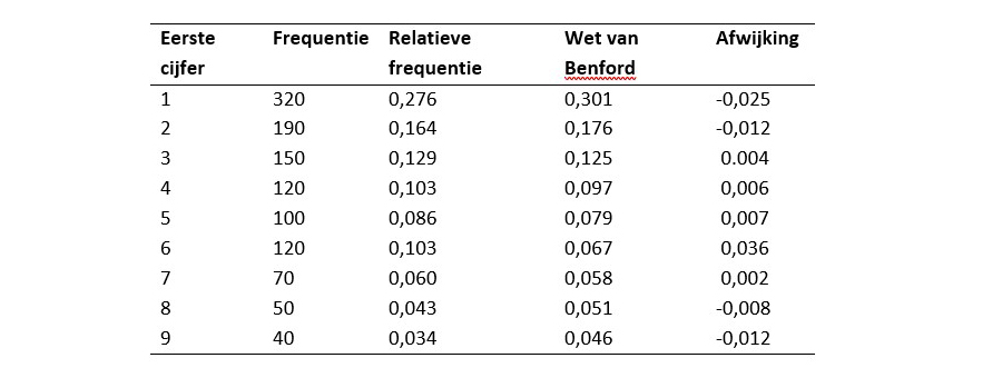 Tot slot is het belangrijk om nogmaals te benadrukken dat het toetsen van de Wet van Benford geen bewijs voor of tegen fraude levert. Afwijkingen van de Wet van Benford betekenen niet automatisch dat er sprake is van fraude. Het kan bijvoorbeeld zijn dat werknemers vaak bij één bepaalde supermarkt boodschappen doen, die zes kilometer van de gebruikelijke route gelegen is. Andersom betekent conformiteit met de wet niet dat er geen fraude is. Zoals eerder vermeld kan een fraudeur namelijk ook anticiperen op deze analyse. Het is daarom verstandig om de Wet van Benford alleen te gebruiken om richting te geven aan eventuele vervolgwerkzaamheden.