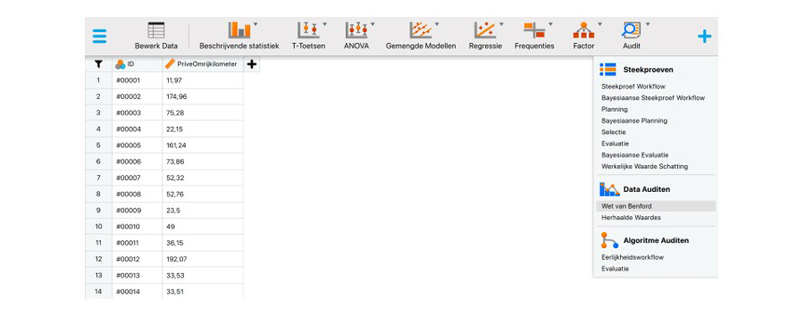 De Wet van Benford is opgenomen in veel auditsoftwarepakketten. Helaas kosten deze pakketten geld en analyseren ze vaak alleen bedragen. De wet is echter ook toepasbaar op andere gegevens, zoals geregistreerde kilometers, gewerkte uren en de duur van inlogsessies2. In deze column laat ik zien ik hoe je met de auditmodule in het gratis open-source statistiekprogramma JASP (JASP Team, 2025) de Wet van Benford kunt toetsen. Zo kun je de regie in eigen hand nemen en de wet zelf op diverse gegevens toetsen.