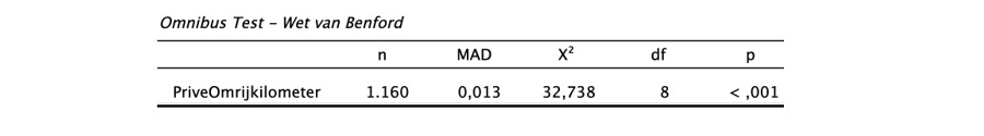 Om te illustreren dat 'natuurlijke' gegevens wel kunnen voldoen aan de Wet van Benford, heb ik nog een ander fictief gegevensbestand met een rittenregistratie online beschikbaar gemaakt10. In deze rittenregistratie zijn de privé-omrijkilometers tot stand gekomen door per rit een afwijking van de meest gebruikelijke zakelijke route te simuleren, waarbij deze afwijking na elke gereden kilometer met 1 procent kans wordt beëindigd. Dit is een natuurlijk proces en de resulterende gegevens voldoen dan ook aan de Wet van Benford. Ik nodig de geïnteresseerde lezer uit om dit zelf te verifiëren met JASP for Audit.