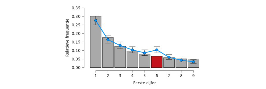 Dit is gebaseerd op het feit dat de verwachte relatieve frequentie van dit eerste cijfer niet in het 95 procent betrouwbaarheidsinterval voor de waargenomen relatieve frequentie ligt.
